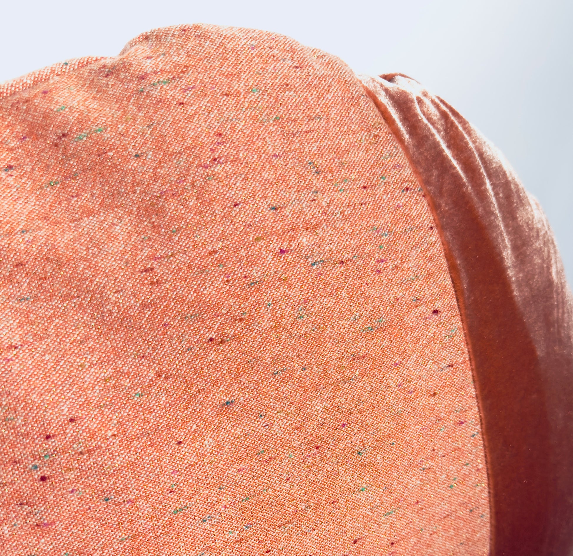Burnt orange soft velour paired with an orange-gold wool blend creates a rich, tactile presence.